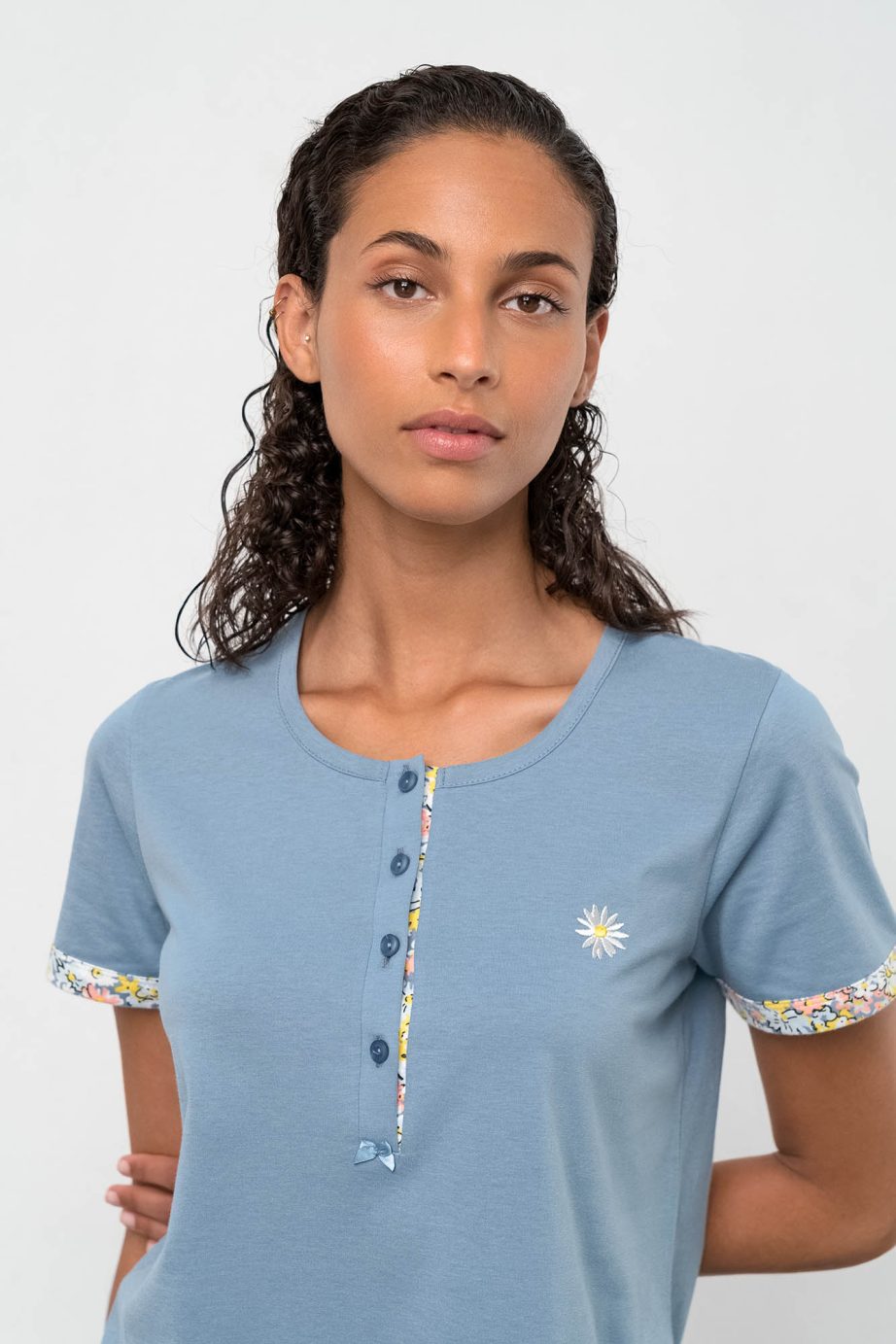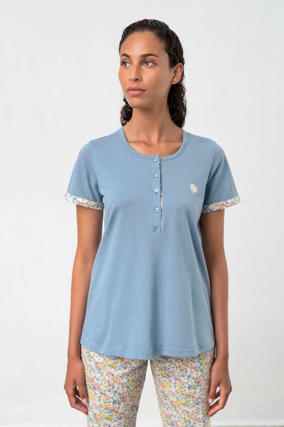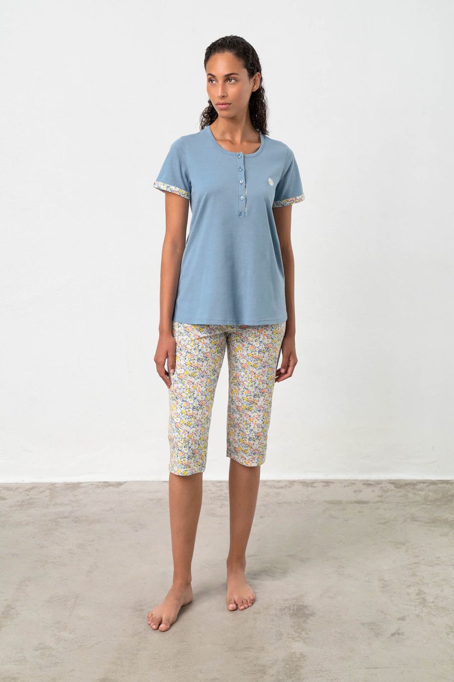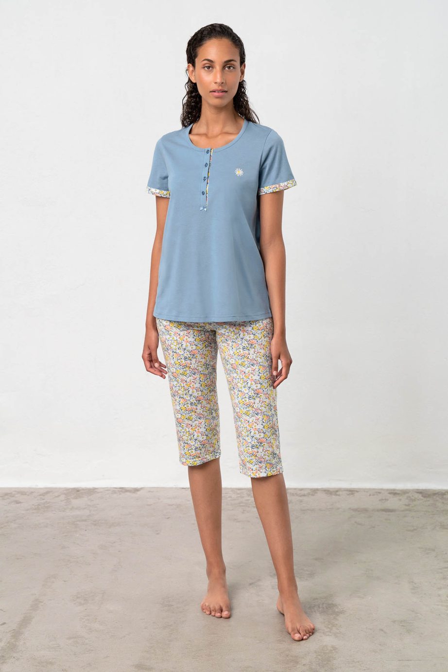 Дамска пижама с къс ръкав, с флорални мотиви, капри панталони и обикновен топ. Яркият принт с лятно настроение ще облече приятно моментите от ежедневието ви.
