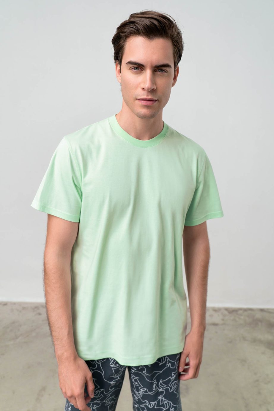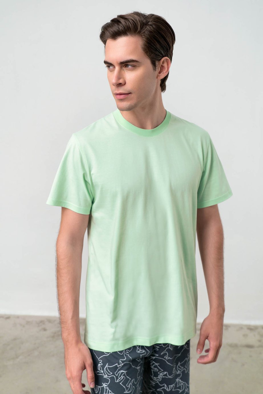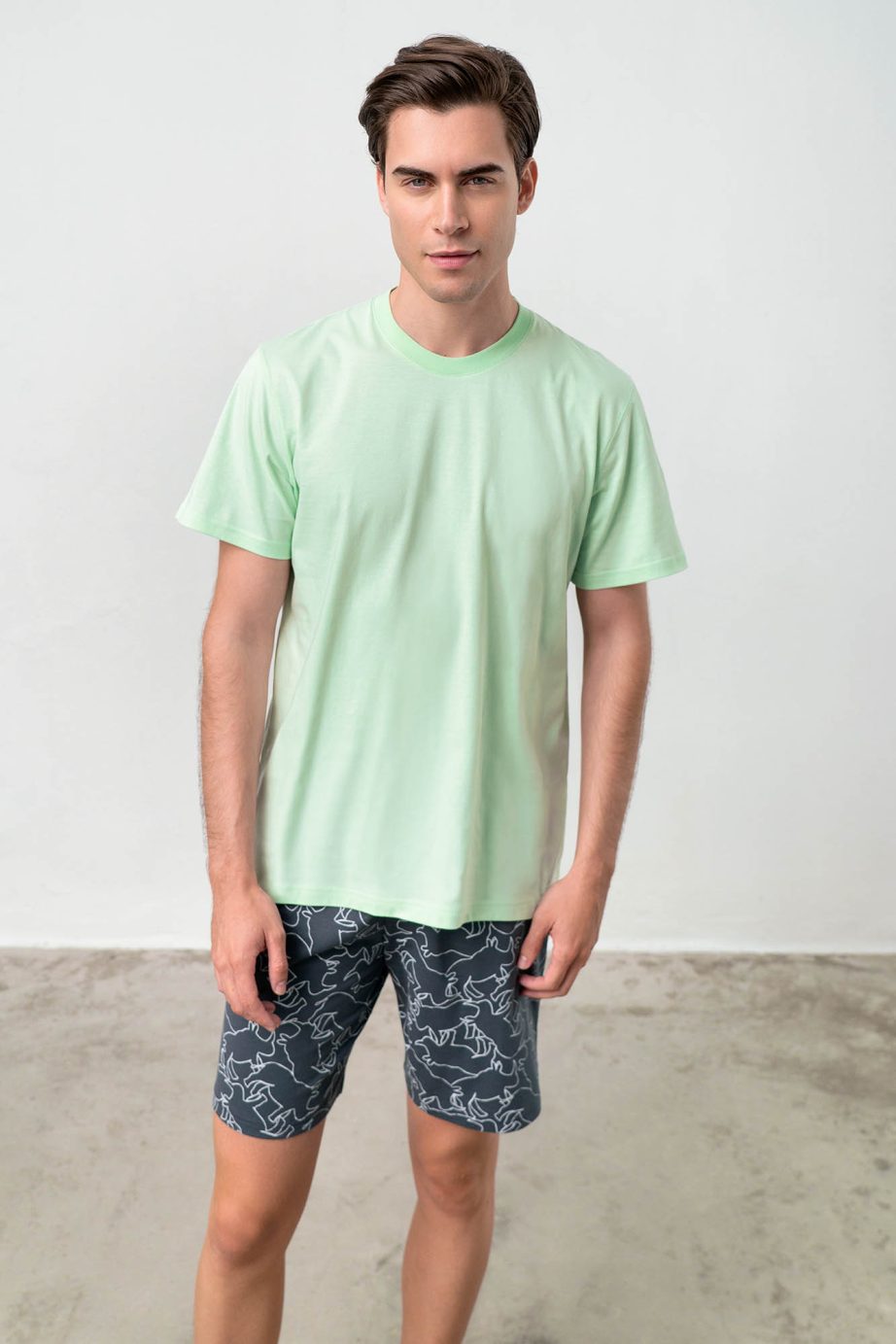 Мъжка пижама с къс ръкав, кръгло деколте и щампа, къси панталони. Изработена от мек и прохладен памук, тя ще придаде комфорт на лятната ви почивка.
