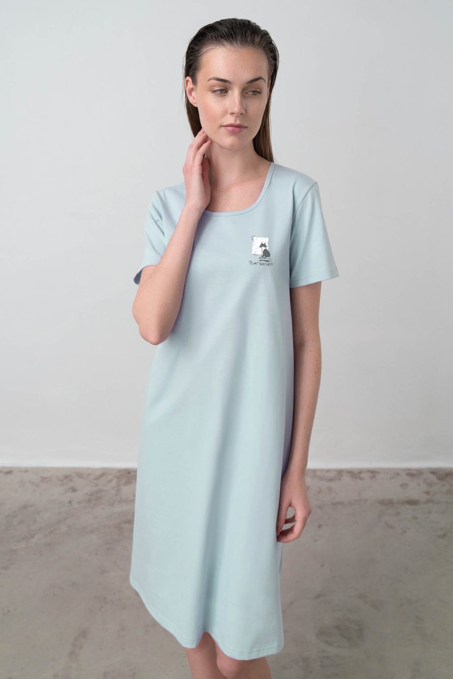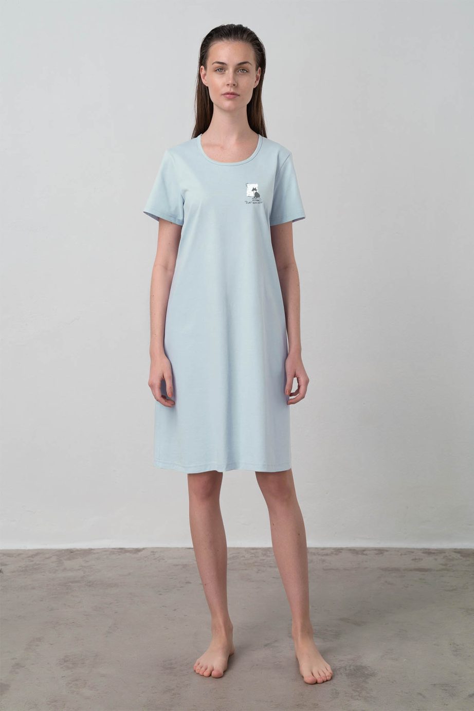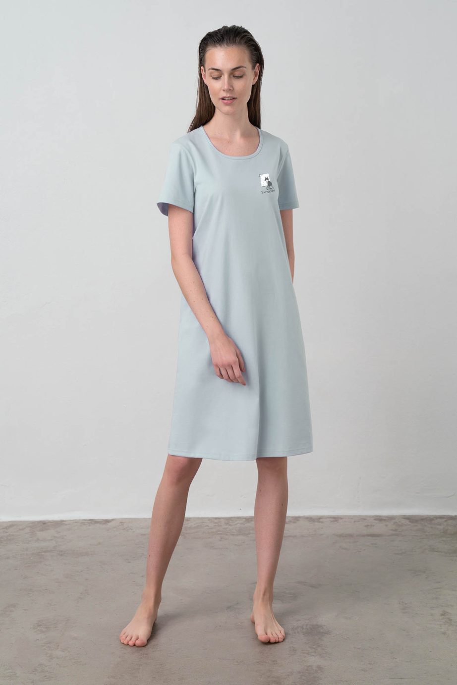 Тази светлосиня нощница съчетава простота и чар, като се отличава със симпатична, отличителна щампа на гърдите за закачливост. Изработена от 100% памучно единично трико, тя е мека, дишаща и идеална за комфортен сън. Късите ръкави и кръглото деколте предлагат класически, спокоен дизайн, а правилната кройка гарантира лекота на движенията и дълготраен комфорт. Идеален за уютни нощи, съчетаващ стил с практичност в ежедневието.