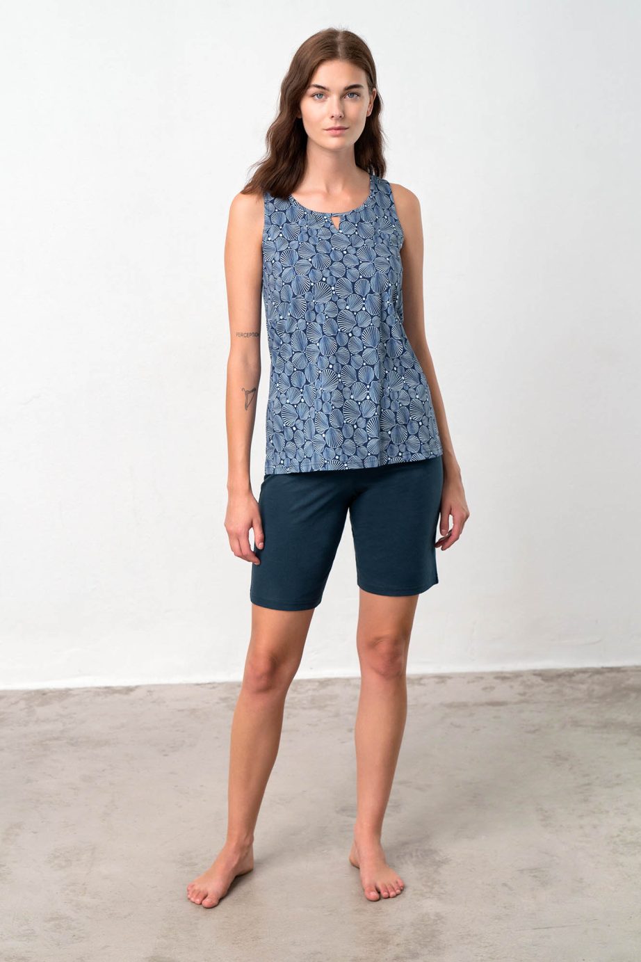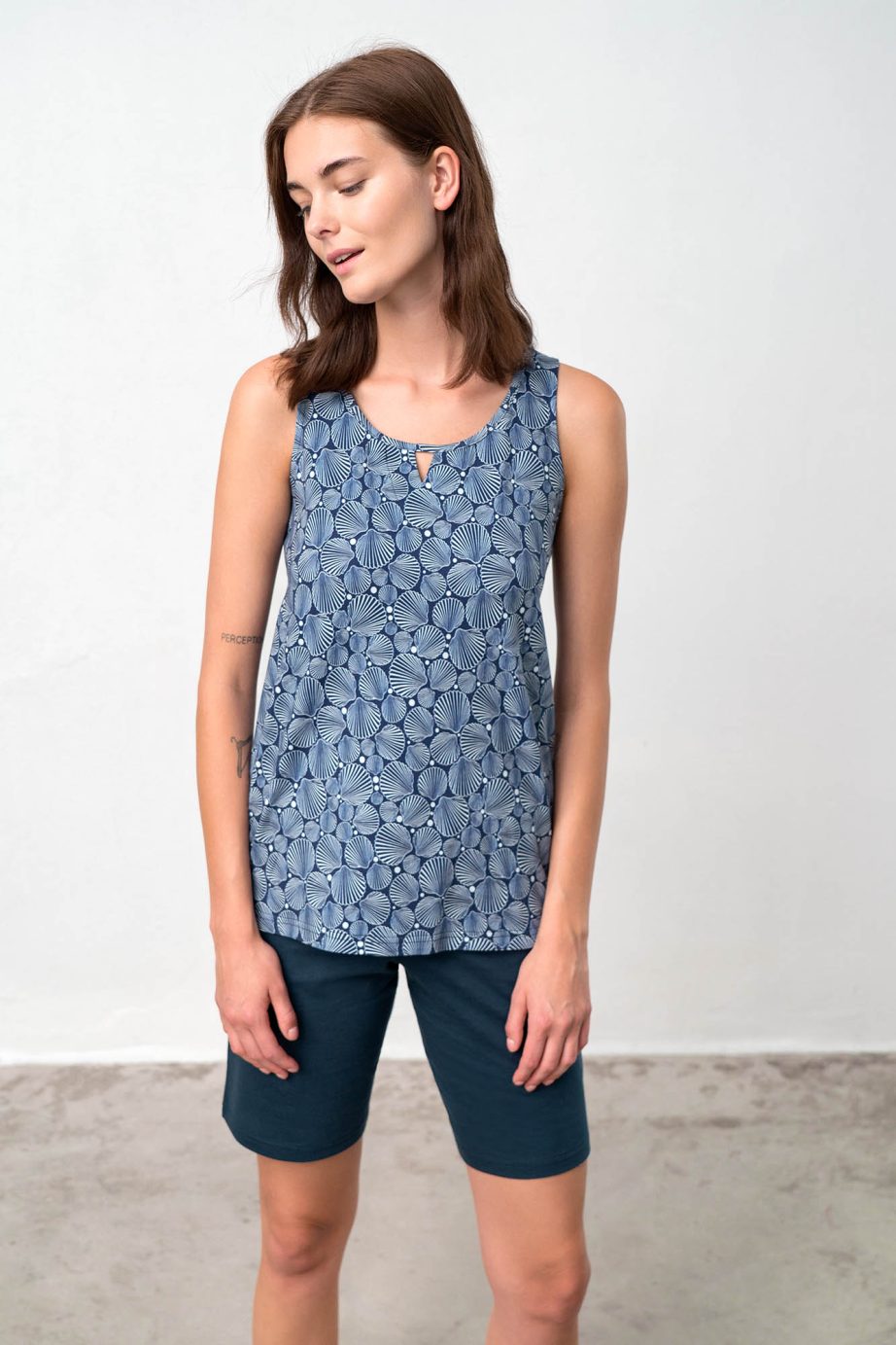 Дамска пижама без ръкави, с кръгло деколте и гладки, къси панталони. Прохладно предложение в сини нюанси, което ще носите през цялото лято.